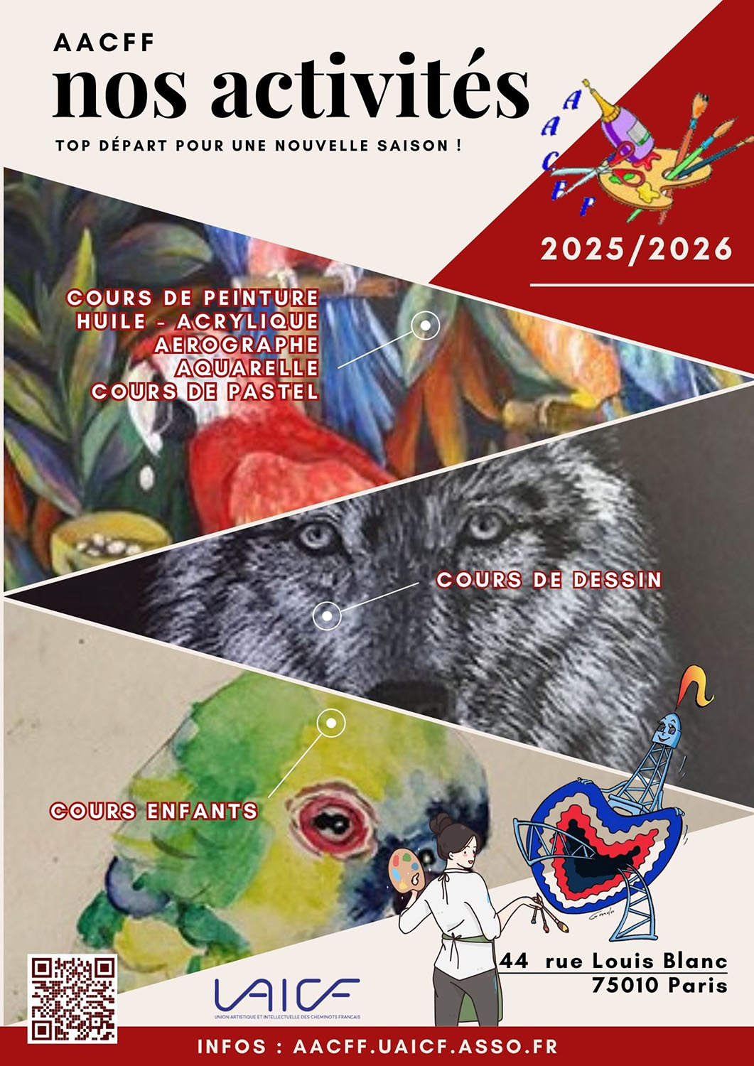 Bienvenue sur notre site : Notre atelier de peinture est situé au 3e étage du 44 rue Louis Blanc à Paris dans le 10e arrondissement (voir le plan). Nous disposons de deux grandes salles bien éclairées par la lumière du jour. Ces deux pièces disposent et tout le matériel nécessaire aux arts graphiques et ces salles sont réservées uniquement à notre association de peinture. Cela permet à tous les adhérents qui le désire, de laisser leur matériel personnel dans les casiers prévus à cet effet. Nous vous proposons des cours de dessin et de peinture à des tarifs très préférentiels pour enfants et adultes. Bien sûr, en plus des cours de dessin et de peinture, les adhérents de tous niveaux et de tous âges trouveront auprès des anciens des conseils utiles qui leur permettront d'évoluer dans leurs techniques dans une ambiance toujours conviviale. Chaque adhérent de notre association a la possibilité d'exposer sur notre site jusqu'à 10 peintures et peut également participer à des stages et aux salons régionaux, nationaux, et internationaux sans oublier les expositions virtuelles. |